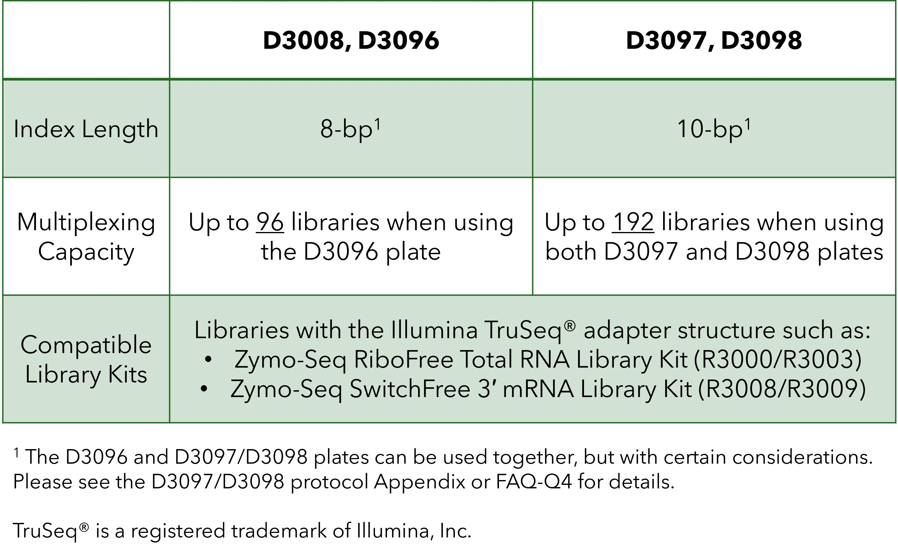 D3097 | Zymo-Seq UDI Primer Plate (Indexes 1-96, 10-bp) | 96 indexes | |